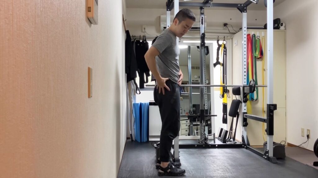 片脚ヒップヒンジ動作を繰り返していく中で、尻の筋肉を使う感覚が少しずつ出てきますので、その感覚が掴める様になったら、”尻の力が抜けない様に”片脚ヒップヒンジ動作を行って下さい。