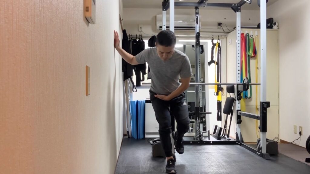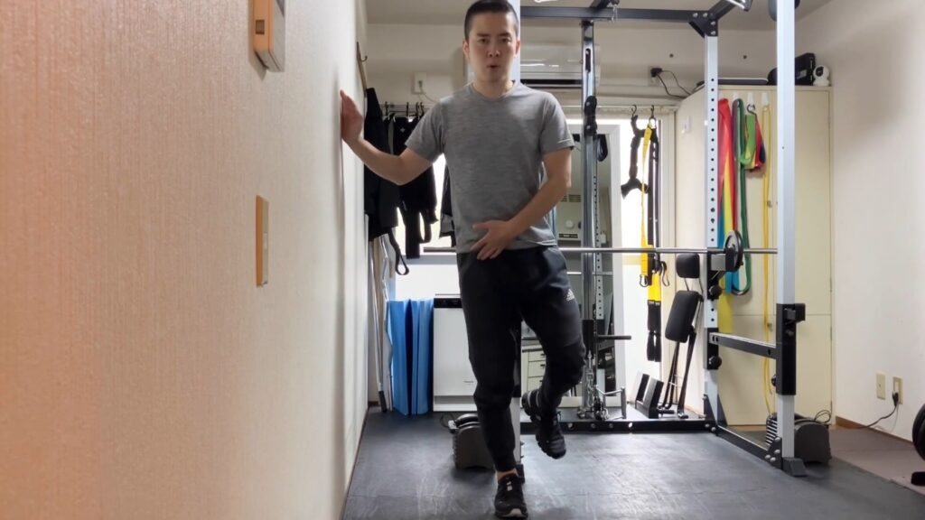 ①壁の横に立ち、片手を壁につき、壁側の脚で片脚立ちになります。